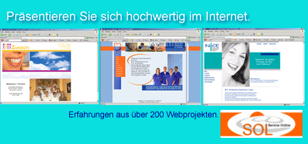 Ein Internetauftritt gehört heute genauso wie ein Telefon oder eine Emailadresse zur Grundausstattung einer Praxis. Die Darstellung im Internet wirkt jedoch im wesentlichen imagebildend und sollte daher Ihr Leistungsspektrum sowie auch das Praxisumfeld adäquat wiedergeben. Darüber hinaus erwartet der Patient von morgen SMS Recallsysteme, Terminvergabe über das Internet und möchte sich durch 360 Grad Bilder einen ersten Eindruck Ihrer Praxis verschaffen. Diese Systeme bietet die SOL heute schon an, so dass die Webpakete ohne Probleme erweitert werden können.