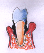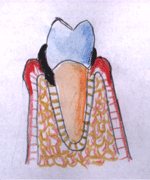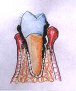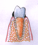 | Es bilden sich dann sogenannte "Zahnfleischtaschen", dieses sind Hohlräume zwischen dem Zahn und der Zahnwurzel, die für den Patienten häufig nicht erkennbar sind. Teilweise können diese Taschen bis zu 10 mm tief sein. Durch das geschwollene, entzündete Zahnfleisch sind sie eventuell noch größer. Haben diese Taschen eine bestimmte Tiefe erreicht, sind so viele Fasern des Zahnhalteapparates zerstört, dass sich der ganze Zahn lockert und/oder anfängt zu "wandern".