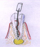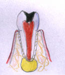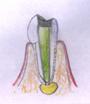 | Wenn der Zahn keine Schmerzen mehr aufweist, kann der "leere" Nervkanal abgefüllt werden. Das geschieht mit einer Paste und Guttaperchastiften (Guttapercha ist ein kautschukähnliches Material). Diese beiden verschließen den Kanal luftdicht, so dass keine neue Entzündung entstehen kann.