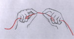 | Hierzu wickelt man die Zahnseide um die beiden Mittelfinger (mehrere Umdrehungen) bis man eine paar Zentimeter gespanntes Stück hat. |
